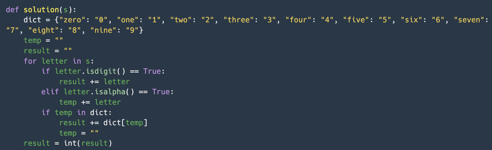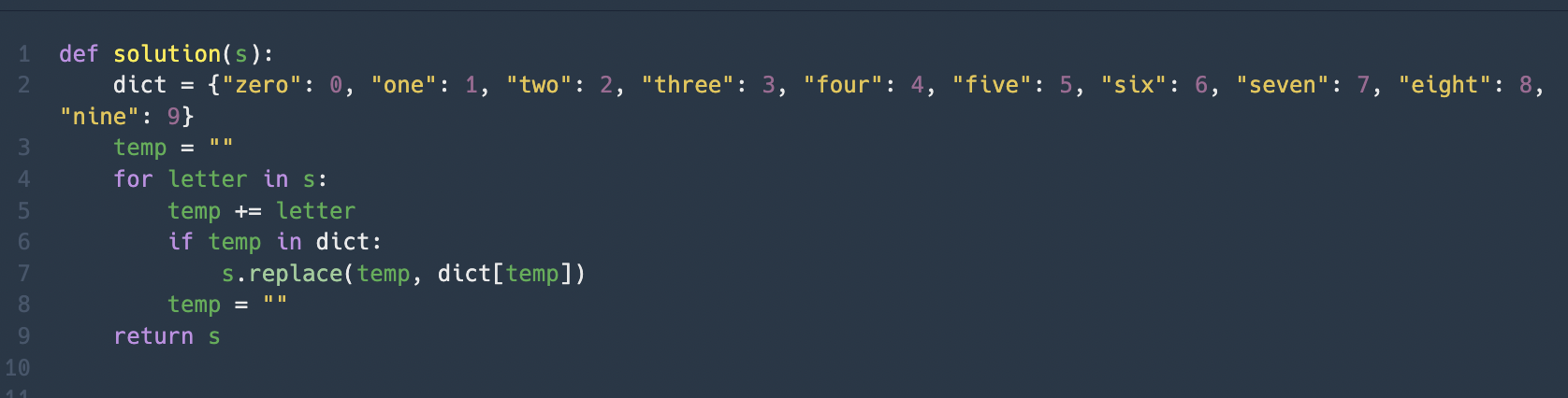 문자열에 알맞은 숫자를 쉽게 대응시키기 위해 dictionary 자료형을 사용했습니다. 야무지게 초기화해주고요, 빈 문자열 temp를 만들어서 파라미터로 들어온 문자열의 글자들을 읽어들이는거에요. 그리고 temp가 dict에 key로써 존재하게 되면, replace 메소드를 통해 key를 key의 value로 대체해주는, 꽤 괜찮은 방식이라고 생각했습니다.