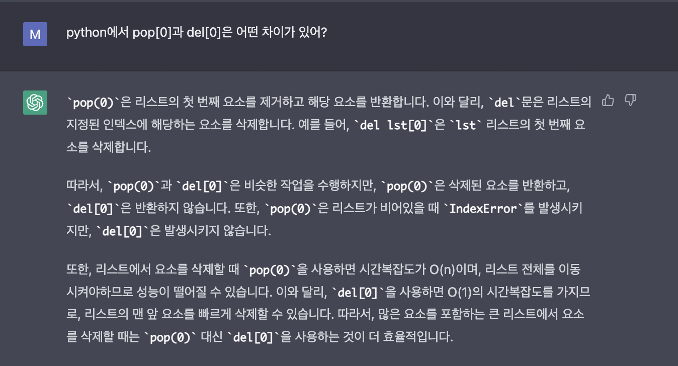 리스트의 맨 첫 요소를 삭제하는 두 명령어의 차이가 궁금해서 chatgpt에게 물어보니까 다음과 같은 답변을 얻었습니다. 결론 : del 을 쓰자!! 삭제할 요소를 반환받을 필요가 있는 경우에만 pop을 쓰기!