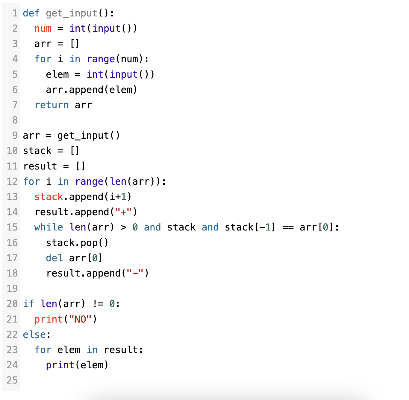 처음에는 이 수열을 만들 수 있는지 없는지를 검사하는 함수를 먼저 짜려고 했다가, 그럴 필요 없이 그냥 반복문에서 스택의 마지막 원소와 만들고자 하는 수열을 계속 비교해주면 되겠더라구요.