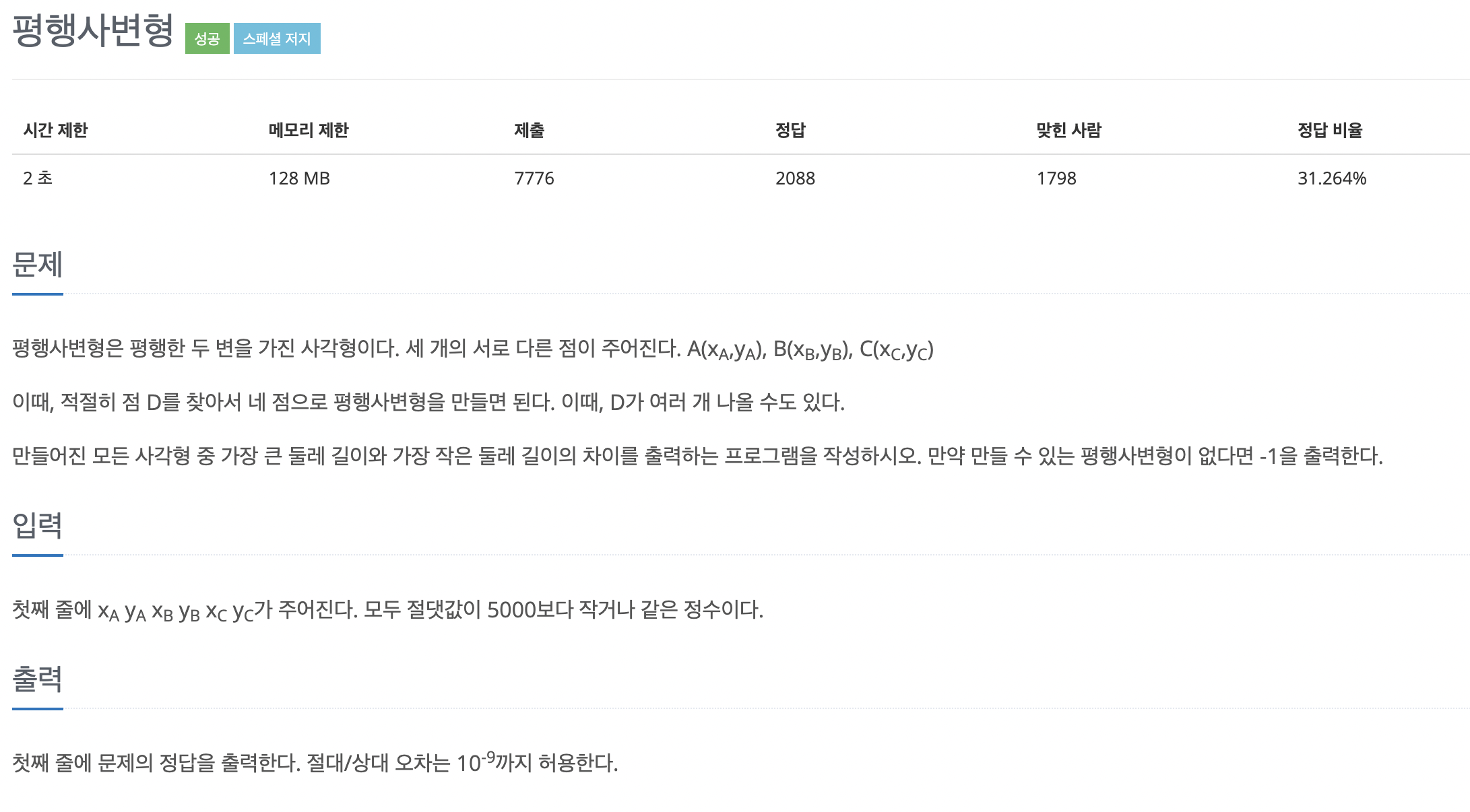 def get_input(): plist = list(map(int, input().split())) A = [plist[0], plist[1]] B = [plist[2], plist[3]] C = [plist[4], plist[5]] points = [A, B, C] return points def get_slope(p1, p2): if p2[0] - p1[0] == 0: slope = "inf" return slope else: slope = (p2[1] - p1[1]) / (p2[0]-p1[0]) return slope def check(AB, BC): if AB == BC: okay = False return okay else: okay = True return okay def get_length(p1, p2): length = ((p1[0] - p2[0])**2 + (p1[1] - p2[1])**2)**(1/2) return length def get_circum(p1, p2, p3): side1 = get_length(p1, p2) side2 = get_length(p2, p3) side3 = get_length(p1, p3) cir1 = 2 * (side2 + side3) cir2 = 2 * (side1 + side3) cir3 = 2 * (side1 + side2) cir_list = [cir1, cir2, cir3] cir_list.sort() max = cir_list[2] min = cir_list[0] return max, min def solution(): plist = get_input() AB = get_slope(plist[0], plist[1]) BC = get_slope(plist[1], plist[2]) okay = check(AB, BC) if okay == False: return -1 maxcir, mincir = get_circum(plist[0], plist[1], plist[2]) gap = maxcir - mincir return gap answer = solution() if answer == -1: print(answer) else: print(answer)처음에 평행사변형을 그릴 수 없는 조건부터 찾아내기 위해 check함수를 도입했습니다. 세 점이 일직선상에 있으면 점 D를 어디에 찍어도 평행사변형이 생기지 않습니다. 그래서 기울기를 이용해 세 점이 한 직선 위에 있는지 검사했습니다. 더 쉬운 방법이 있을 것 같기도 하네요.
